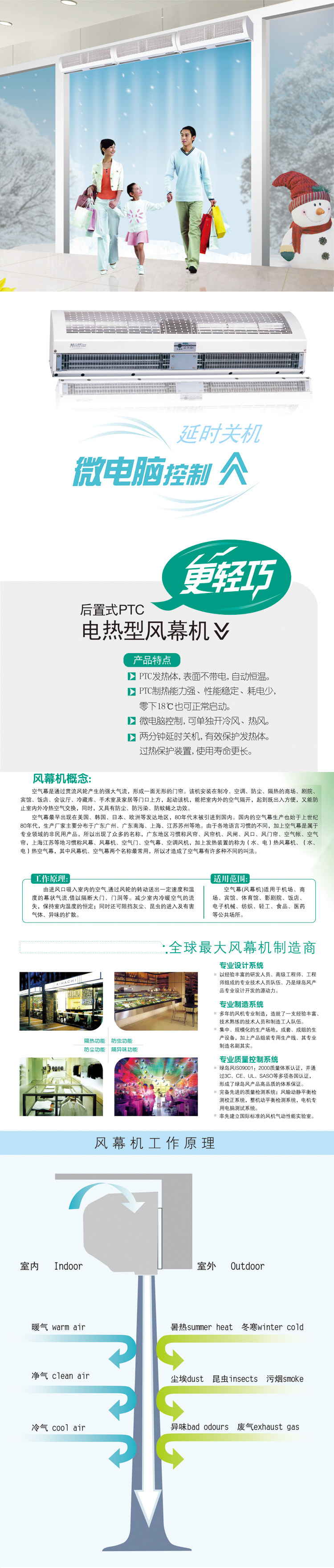 1、采用表面不带电的PTC发热体,具有安全性能极高、升温快和自动恒温功能,形成很好的热空气幕墙。